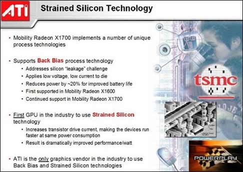 ATI的X1700移动版显卡是ATI首款采用80nm制程的独立显卡,也是业界第一款采用应变硅技术生产的图形芯片,而应变硅技术最大的好处就是缩小了电阻值,在保持功耗不变的基础上,性能/功耗比得到提升。X1700拥有12像素着色器管线和5个顶点处理器,与Geforce Go 7700的规格一致。X1700支持ATI的 PowerPlay 6.0电源管理技术,拥有Power-On-Demand时钟门控、动态电压控制和X16到X1 PCI-E通道控制,并包括用户可选的“性能”、“平衡”和“电池”电源模式以灵活控制功耗。除此,X1700为支持HD-DVD和蓝光的笔记本提供了Avivo增强高清晰视频加速能力。从F3Jp的体验中发现,X1700在标准接上电源、最高性能、高性能、游戏的情况下核心以及显存频率为459MHz/392MHz,在其他模式的频率为392MHz/252MHz。