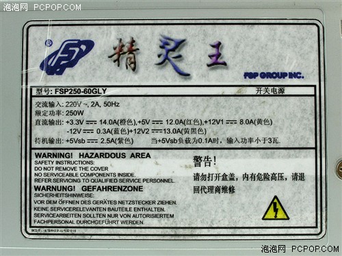 从电源的铭牌上我们可以看到,FSP精灵王是一款符合INTEL ATX 12V2.2规范的电源,其额定输出功率位250W,其两路+12V的输出分别为8A和13A。