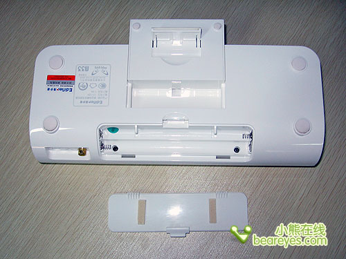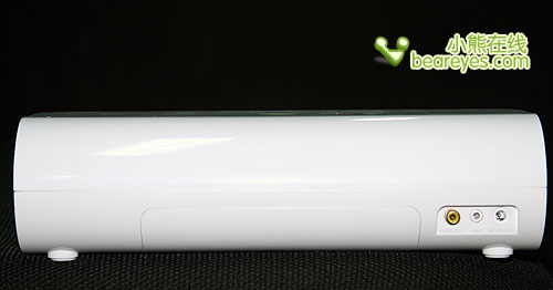 M33背面右下角提供了电源适配器插孔、视频输出插孔和音频线插孔。有了音频线插孔,M33也可以作为普通音箱使用。这样就比M0的使用范围广泛了许多。此外,漫步者 M33与其它普通iPod扩展音箱最大的不同在于它考虑到了iPod Video的视频功能,提供了视频输出插孔,是一款影音结合的产品,非常实用,考虑的相当周到。