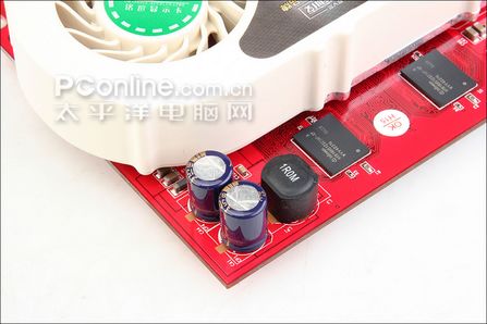 核心和显存采用了分离供电,供电部分用料毫不马虎,采用了高品质的日系红宝石和KZG电容,而散热风扇吹出的风正对供电电路,能起到良好的辅助散热效果。
