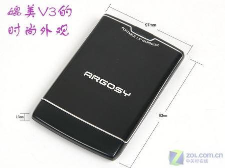 奥格赛 HD160移动硬盘标配1.8寸微型硬盘,这给设计师提供了很大的自由创意空间,才能让机体拥有如此超薄时尚的外形。它的机体厚度仅13毫米,比起MOTO V3手机的13.9毫米还要薄不少;其表面使用了大量流畅曲线设计,在上下两端还设计了银色线纹,看上去很有些MOTO V3的味道,而且它的整体重量也仅有81克,足可谓轻薄时尚。但是它并非一款手机,而是一款不折不扣的移动硬盘!