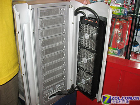 Tt水冷甘道夫机箱与普通甘道夫机箱外观并不像同,并没有采用那经典的炮筒设计,而是使用了铝合金面板中间镂孔的设计。通过镂空的网眼部分大家可以清楚地看见里面的三个12cm大口径风扇。铝合金面板环抱在光驱面板之前,中间预留的空隙明显比普通机箱要大。因为在这里面藏有水冷设备的肺:换热器。