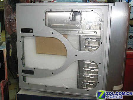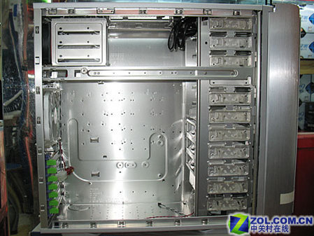 机箱内部空间非常宽敞,可以容纳绝大多数的市售主板,并且可以容纳高端的大显卡。采用优质的铝合金材料,铝合金板材的厚度达到了1mm。并且采用了贯穿式扩展位设计。机箱边缘密布防磁弹片,防止机箱内部的电磁辐射外泄。机箱内部全部采用了卷边设计,保护用户在使用时不会划伤皮肤。机箱具有8个光驱安装位,其中3个已经被硬盘支架所占据。背后还有1个3位硬盘安装支架,总共可以支持6块硬盘。支架都可以拆下,供用户自由搭配配使用。