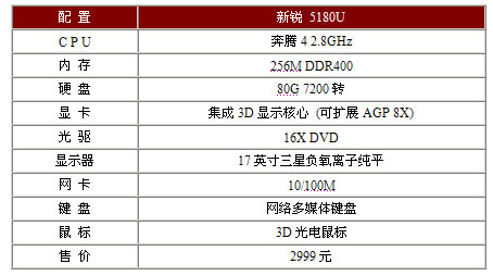 场”大旗,限量推出的新锐 5180U 采用奔腾4 2.8G处理器配DVD光驱/80G高速硬盘以罕见的2999元震撼价格出击,彻底打破赛扬系列处理器长期占据的三千元以下低端市场格局,真正做到了低价PC的超级杀手。