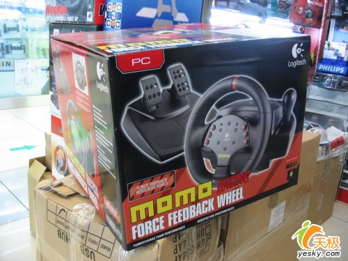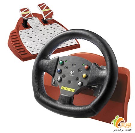 罗技MOMO力反馈天驹(MOMO Force wheel)完全参照法拉利一级方程式赛车方向盘的设计,方向盘可以270度自由旋转的方向盘,包裹着一层手工缝制的皮革,手感甚至比真车上的方向盘还要好。可选手动档、自动档,纯铝制的油门和刹车踏板、6个不同颜色的可编程按钮适合各种赛车类游戏。