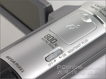 电池上方则是主要的控制区域,包括了常见的三段式模式选择按键,录制按键,快门按键以及变焦按键。另外,机身上侧,还有红外线夜视按键。