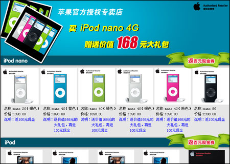 这次促销的产品包括一款2GB的nano,4款不同颜色的4GB nano和一款8GB nano播放器,价格分别从1398元到2398元不等,其中购买2GB、8GB两款产品均可以得到100元的现金返券,而4款彩色4GB nano除现金返券外,还会有价值168元的大礼包赠送。另外,购买30GB或80GB容量的Video2代,也会获得100元的现金返券,这两款产品的价格分别为2398元和3298元。