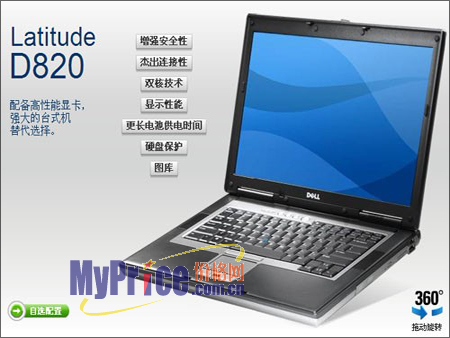 在配置上,D820采用的是Intel Core Duo T2400处理器,主频1.83GHz,Intel 945PM芯片组,nVIDIA Quadro NVS 120M显示芯片,512MB DDR2内存,80GB硬盘,独立显卡,集成AC97音频芯片,可实现20位立体声数字转换模拟和18位立体声模拟转换数字,D820还配置了COMBO光驱和15.4英寸液晶宽屏。