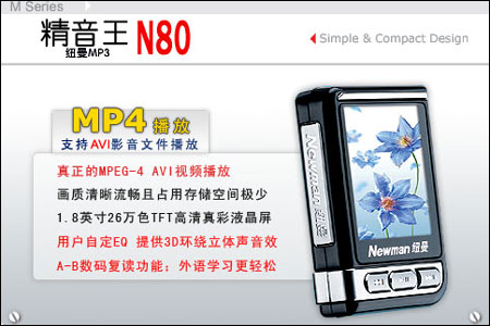 纽曼这次降价的产品型号为N80,是一款典型的低端彩屏MP3,容量为1GB的N80由359元降为299元,即使比起那些杂牌山寨厂的产品,也丝毫没有价格上的劣势。N80采用工程塑料外壳,看上去很像一款mini型的智能手机,1.8英寸的26万色屏幕几乎占据了N80正面80%的面积,功能方面,N80除了支持MP3、WMA等格式音频播放以外,还支持AVI视频播放,以及收音、录音、图片浏览、电子书等功能,值得一提的是这款产品还提供了俄罗斯方块等内置小游戏,供玩家听音乐之余消遣。