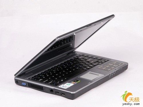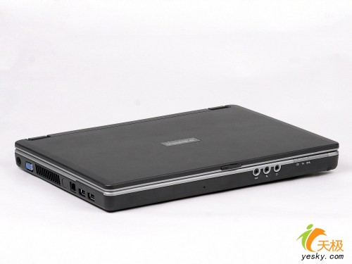 超锐V400搭配了NVIDIA芯片组,板载集成了NVDIA GeForce Go 6100显卡,512MB DDR2内存,80GB硬盘,整机性价比有了小幅提升。V400的机身材质为硬质工程塑料,硬直角的机身边缘,显得机身格外厚重。