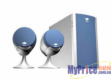 采用木质低音炮和塑料卫星箱体的设计,造型时尚新颖,低音炮以蓝色为主,两边镶有白色边框,两个卫星音箱采用喇叭式的设计,非常小巧漂亮。