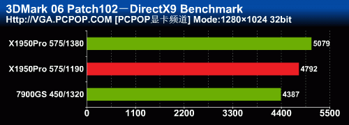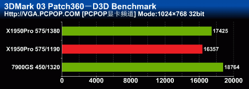 比起3DMark03/05,3DMark06得分更具代表价值,它能够和大部分游戏的测试结果相吻合。可以看出三款显卡的成绩呈阶梯形排列,双敏非公版X1950Pro比公版损失了6%的性能,但要比7900GS强10%以上!