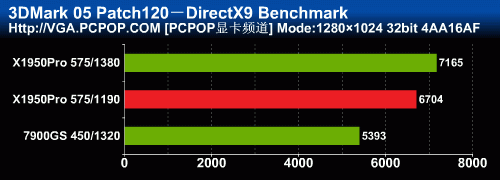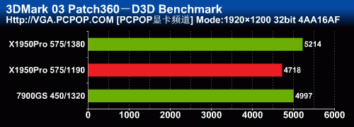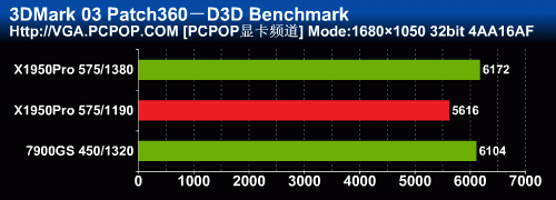 3DMark03中N卡占据一定的优势,而在3DMark05中A卡像素:纹理=3:1的架构能够最大限度的发挥出优势。从测试图中可以看出,两款X1950Pro把7900GS远远的甩在了后面。由于频率的差距,双敏非公版X1950Pro的性能比公版损失了大概6%-7%,不算太多。