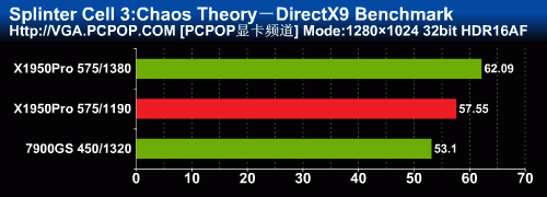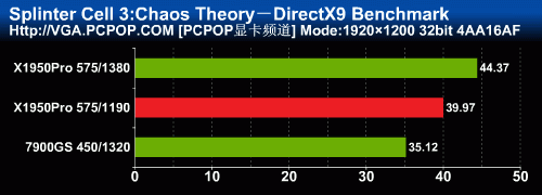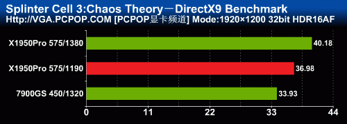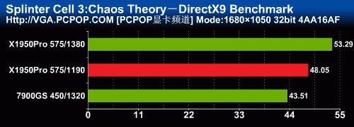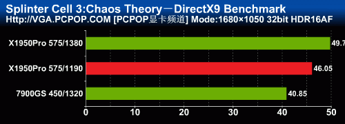 细胞分裂在打开AA时的性能表现与FarCry非常相似,公版X1950Pro的性能与7950GT差不多(以前的测试成绩在这里),而非公版X1950Pro在1280下与79GS相当,1680以上分辨率差距就拉开了,再次显示出了X1000架构强悍的抗锯齿性能。