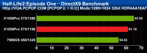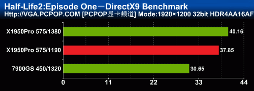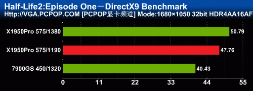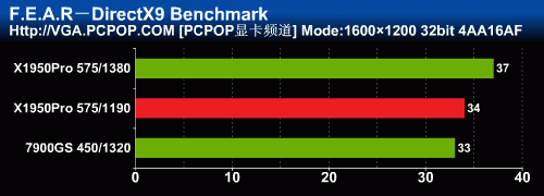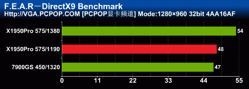 FEAR中非公版X1950Pro的性能和7900GS差不多,显存频率的差别如实地反映在了游戏FPS中。如果我们对双敏X1950Pro进行小幅超频,相信达到公版的水平没有什么难度。