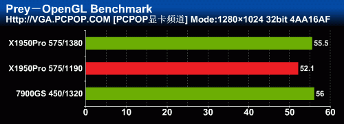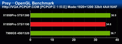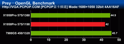 OpenGL游戏是N卡的传统强项,但ATI在X1000一代也不断的优化OpenGL性能,再加上A卡的AA效能比较高,所以我们看到公版X1950Pro在Prey中的性能与7900GS完全相同,这可以说已经来之不易!由于非公版X1950Pro频率稍低,所以性能小幅落后,但也就只有2-3帧而已,几乎可以忽略不计!