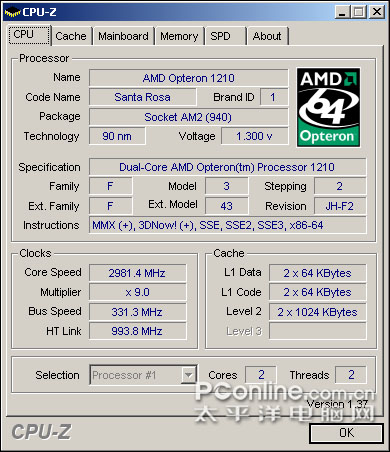 处理器编号为“OSA1210IAA6CS”,按照惯例开头字母串“OSA”即表示处理器为Opteron系列;“1210”为处理器型号;“IAA”依次表示接口类型(AM2)、电压(1.4V)及温度(A表示可变);最重要的L2标识为“6”,说明处理器为1M×2的L2配置;“CS”则说明了处理器的工艺及制程与普通Athlon没有什么区别,都采用了90nm制程(编号“C”,编号“B”同样是90nm制程标识),“S”标识说明处理器采用了与“Windsor”类似的核心。使用CPU-Z显示的核心代号为“Santa Rosa”。