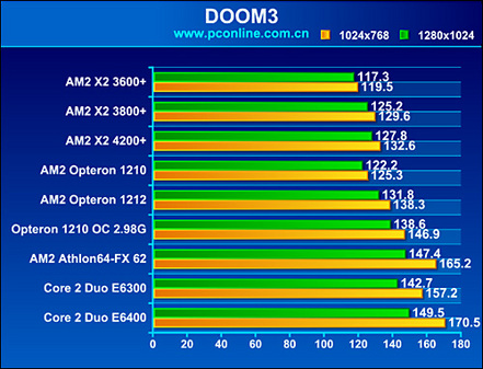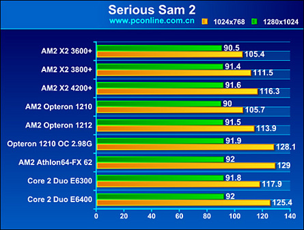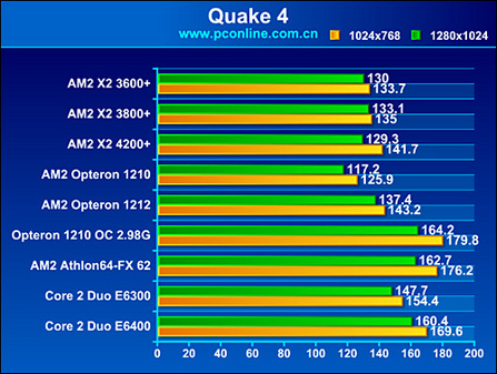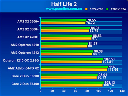 在游戏效能实测项目中,Core 2 Duo E6300和E6400的表现相当出色,成绩几度逼近Athlon FX-62,而AMD双核方面依然是频率越高速度越快,但在频率相同的情况下,L2容量较大的型号表现也要更为出色一些。