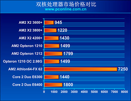 经过以上多个方面的详细测试,相信大家对Core 2 Duo和AMD全系列双核处理器的性能有一定了解,实际表现证明,Core 2 Duo E6300/6400在很多项目中的表现都相当出色,但是依然没有办法轻易说明E6300大概等于什么级别,不过在价位相若的产品中,Conroe的性价比明显要高于AMD,为了方便大家分析对比各款双核处理器的性价比,我们列出了多款参评产品的市场参考价格(以上为11月28日广州