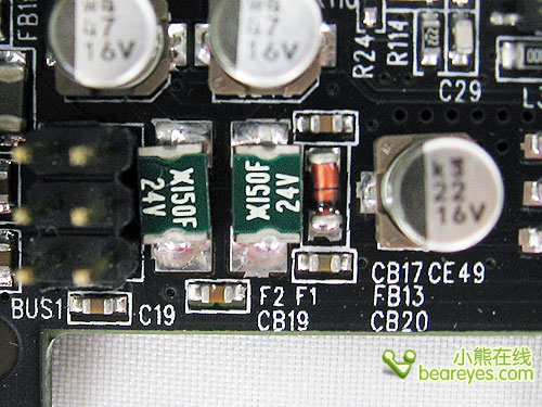 两个绿色的贴片零件是可恢复的保险丝,是用来保护运放和内置CODEC的供电电压。OOAOO细心的设计,避免了一些不懂的(菜鸟)插反运放而烧毁声卡。