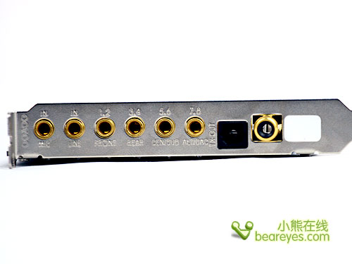 6个3.5mm的音频信号接口都是采用了镀金设计,从左至右分别是MIC IN、LINE IN、FRONT 1/2、REAR 3/4、CEN/SUB 5/6、ALT/DAC 7/8和数字光纤输出接口,同时还设计有S/PDIF数字音频输出接口。