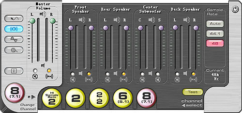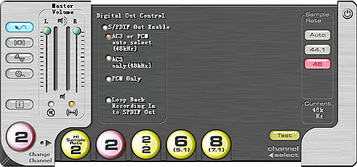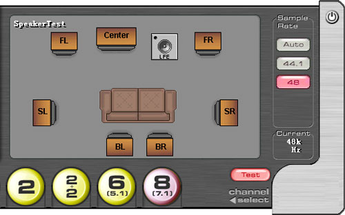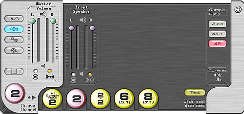 上图是驱动中自带的操作软件,名字为AUDIO DECK。傲王SQ714W的操作界面与之前不同了,这次的显得更美观,更简单易懂。左边第一项也就是蓝色的那个按钮是对数字光纤输出和同轴输出选择不同的输出方式。而右边的粉红色按钮是用来调节采样率的。Master Volume为主音量的调节。