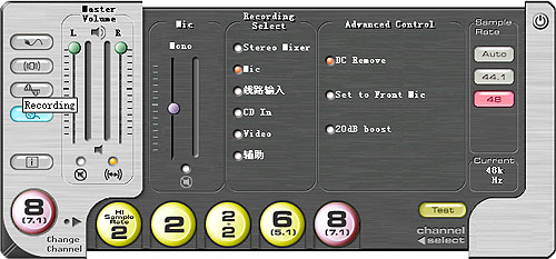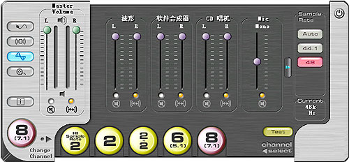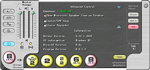 此界面可以对Windows的声音调节界面的显现、立体声加重和使用平滑图形界面进行控制。另外还有语言的调节,可以选择英文或者中文,只是选择中文以后,界面出现的不是中文而是乱码,也就是说这个选项适合那些能看得懂乱码的朋友。同时下面还有驱动版本的信息等。