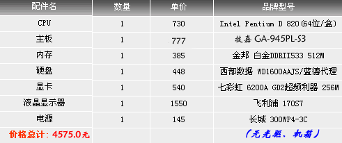 本人感觉,就目前来说,Intel Pentium D 820和AMD速龙3000+是近一时期比较受欢迎的处理器,特别是最近几个月以来,双核CPU的价格是越来越低,其整体的性能要超过速龙3000+,考虑到公司办公可能需要强劲的数据处理能力,故选择现在性价比较高的Intel Pentium D 820。另外要运行稳定,笔者还是选择有口碑的技嘉 GA-945P-S3,基于Intel 945PL/ICH7芯片组,支持533/800/1066MHz前端总线设计,采用LGA775接口,支持目前主流的奔腾D、酷睿2等处理器。板载网络接口和集成声卡接口。目前其777元的价格相当的超值。