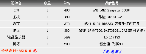 这台配置机型是AM2平台,主要定位于校园学子型或是入门级别用户,由于最近AM2平台的处理器处于缺货状态,特别是闪龙2800+,上涨势趋势明显,因此我们选择较2800+强劲且有性价比的3000+,而昂达N61GT的板子也是闪龙系列的最佳搭档,其内置6100显示芯片组,可以玩些非主流的游戏,且价格也相当便宜,仅为499元。内存选择目前主流512M,硬盘为80GB,对于一般的学生朋友们还是足够的。另外显示器可以说是这套配置的一个亮点,这款LG 1719S拥有1400:1的对比度,显示效果相当不错,值得用户选购。