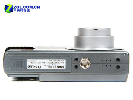 明基E720机身顶部仅有一个电源开关和快门键,底部也是较为常规的电池仓以及三角架螺口,螺口的位置靠近中央同时也增加了相机的稳定性。
