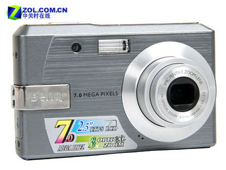 明基E720采用一块1/2.5英寸、700万像素的CCD,同时配备一枚6.2-18.6mm,F2.8-5.2三倍光学变焦宾得超级防眩光多层镀膜镜头,镜头共6片5组,实际焦距等效于35mm相机的37.5-112.5mm。