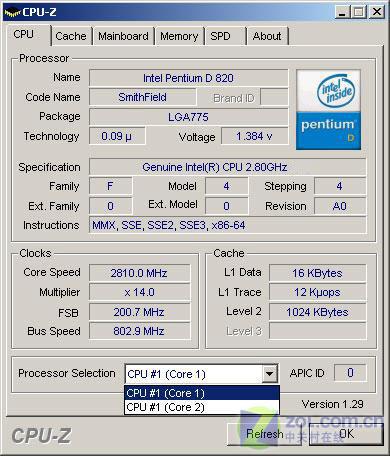产品核心代号为smithfield,处理器家族编号(Family)为F,产品型号(Model)为4,步进值为A0,倍频为14,前端总线(Front-Side Bus, FSB)为800MHz FSB,支持MMX、SSE、SSE2、SSE3、X86-64指令集,从底部“处理器选择”项中可以看出为两个实体核心。
