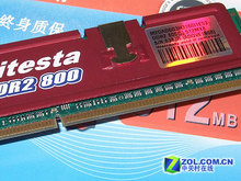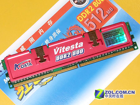威刚红色威龙512MB DDR2-800内存加装了亮红色散热片,非常引人注目。“A-DATA”和“Vitesta(红色威龙)DDR II 800”字样异常显眼。