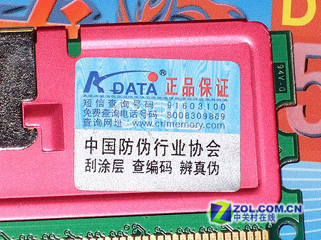 威刚红色威龙512MB DDR2-800内存粘贴了由中国防伪行业协会提供的荧光粉防伪标签,可刮开防伪涂层将得到的编码通过拨打8008309889免费电话或发短信至91603100加以查询。