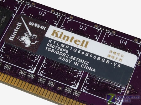 金特尔1GB DDR2-667内存规格编号为KTLMP1G64B08BBB-Y5,生产编号为060728P8,产品速度为667MHz,设计容量为1GB,整条内存封装于中国。