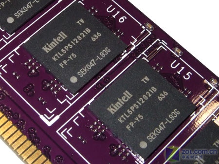 金特尔1GB DDR2-667内存采用非常少见的紫色PCB电路板设计,正反面总共有16片内存芯片,产品做工良好,边角裁切平整,没有毛刺出现。