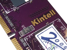 金特尔1GB DDR2-667内存PCB电路板正面中央部位印有“Kintell”烫金字样,起到了防伪效果保存内存信息及参数的SPD芯片也安放在这个位置。此外,该内存的金手指使用了先进的电镀金工艺,金层色泽圆润,厚度均匀。