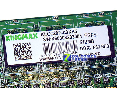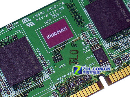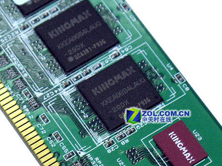 胜创512M DDR2-800台式机内存采用带有“KINGMAX”字样的内存颗粒,采用FBGA封装模式,0.11微米制造工艺。编号为KKEA88B4LAUG,响应时间为2.9NS。该产品金手指采用技术成熟的化学镀金工艺制造,其PCB边缘切割整齐。