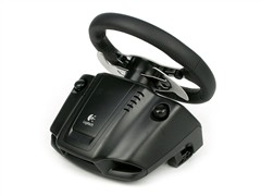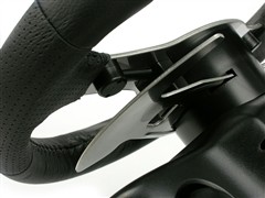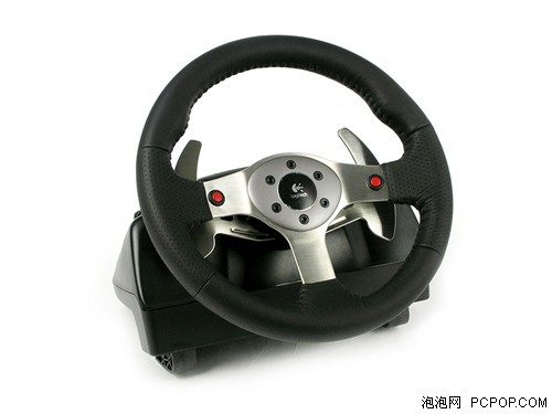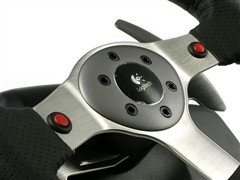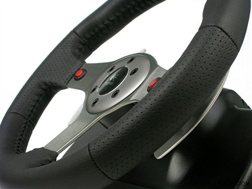 G25方向盘的整体外观为纯黑色,圆盘支架与两侧的手挡装置则采用了不锈钢制成,显露出稳重而高贵的气质。其采用了大尺寸设计的11寸圆盘,与真实情况非常接近。盘面上并未集成过多的功能按键,仅仅设计了两个红色的功能键,这样简洁化的设计风格在游戏方向盘中还是比较少见。