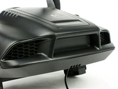 方向盘底座采用了坚固的工程塑料材质,可以为圆盘提供稳定的支撑。不过由于其体形较小,与大尺寸的圆盘组合在一起,给人“头重脚轻”的感觉。其顶部凸起部分好似汽车的发动机盖,而前端进气口+蜂窝槽的设计更是极具动感,整体造型就是一个小型赛车的车头。