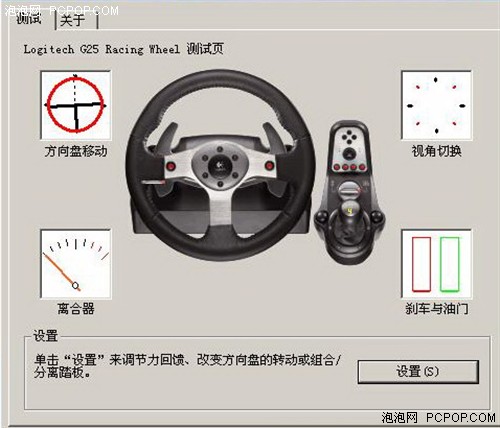 接下来,接通电源,连接USB接口,开始安装驱动,一路点击“下一步”之后我们就迎来了G25的“测试”页面。如果您以前使用过罗技的方向盘,一定不会对这个界面感到陌生的。