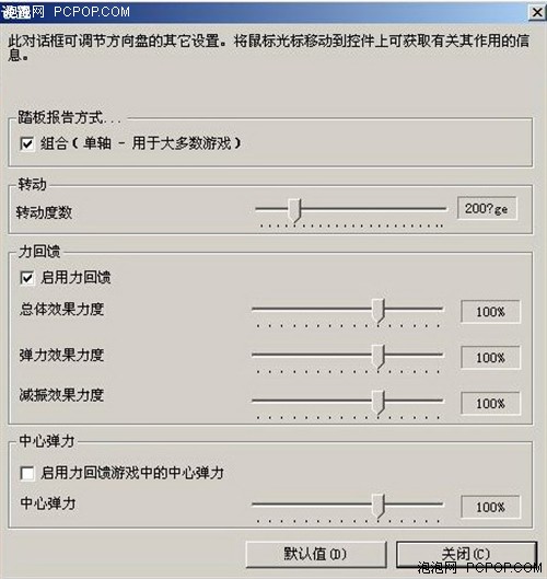 在以上这个“设置”页面中,用户可以自行选择脚踏板的报告方式、设置方向盘的转动度数、调整力回馈的力度以及方向盘“回中”的力度。在默认值情况下,方向盘的转动方向为200度,对于习惯了普通方向盘的玩家来说,上起手来还是比较容易的。