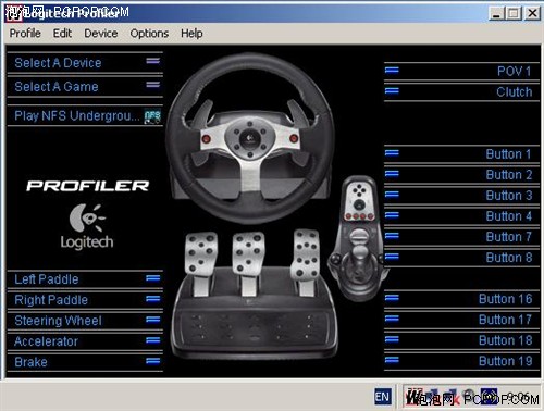 驱动安装完成后,点击任务栏右下角的“Profiler”,我们就会看到G25“三大件”上每个按键的名称。在这里,用户可以选择与特定游戏进行关联,从而记录不同游戏下的按键设置情况。