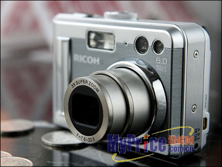 理光RR630的外观朴实无华,机身颜色为银色。机身正面3倍光学变焦镜头占据了1/3的空间。在镜头的上方闪光灯、光学取景窗和自拍指示灯从左至右一字拍开。机身整体采用塑料材质,不过为了保证相机的坚固,在顶部和前部的一些区域采用了铝合金的材质。