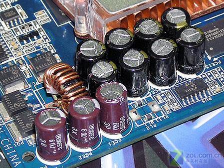 华硕7600GT整体做工扎实,元件焊点饱满,看上去非常舒服。显卡的做工比较到位,采用了核心/显存独立供电方式,能有效地分摊供电负荷。元器件方面采用了日系大厂名片电容,充分体现了华硕一线大厂的风范。