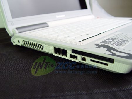 机身左侧依次是电源接口、散热孔、网卡接口、MODEM接口、USB2.0接口、IEEE 1394接口、3in1读卡器和PCMCIA扩展卡插槽。略微显得遗憾的地方是F40并没有提供PC express卡的插槽,不过对于用户来说,市面上暂时也没有此类外设出售。而前方摆放了较多的接口,平时用的时候接入设备都很方便。