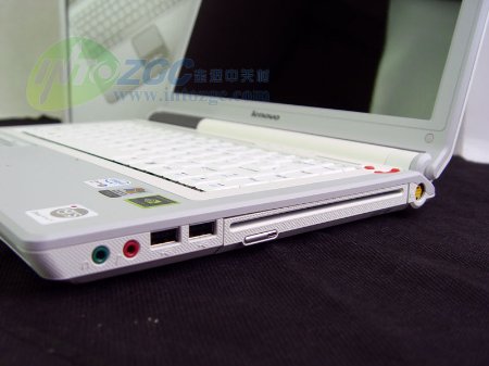 右侧是耳麦接口、2个USB2.0接口、吸入式康宝光驱和S-Video接口。