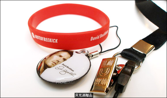 随着贝克汉即将到日本宣传 maxx V3 及 V6,在香港只要买 MOTO 任何一款手机也可获得贝克汉赠品,包括有小贝签名的橡胶手环、手机挂绳及有小贝肖像的屏幕擦拭布,台湾并不确定是否跟进,只能说香港小贝的粉丝们有福了。
