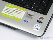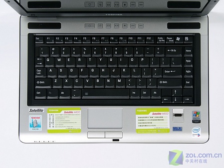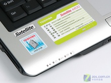 M100手托部分贴满了贴纸,这主要包括Toshiba笔记本的Logo,笔记本配置表以及特色功能。从特色功能表上我们可以会看到这款笔记本支持蓝牙,这在酷睿的M100上是没有的。另外指示灯与手托一体化的设计让人看起来很舒服。