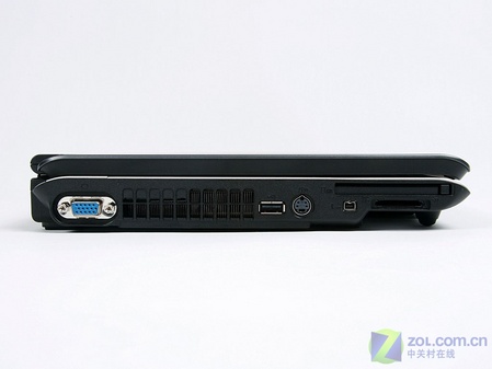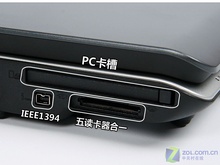 左侧接口比较多主要是USB、显示以及外设接口,15针VGA、S端子、IEEE1394接口一个不少,另外支持SD卡,xD卡, Memory Stick,Memory Stick Pro, MMC卡的五合一读卡器更加凸显其商用家用两相宜的特色,而散热孔的左侧设计更是防止热气侵袭使用鼠标的右手。